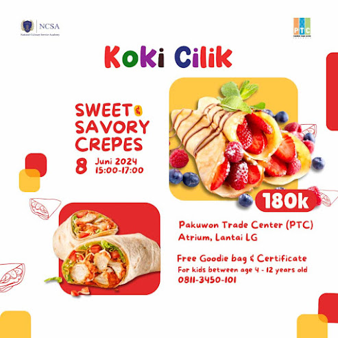 Kini, mimpi itu bisa menjadi kenyataan! NCSA Indonesia dengan bangga menghadirkan Kelas "Koki Cilik : Sweet & Savory Crepes" yang akan diadakan pada tanggal 08 Juni 2024 di Pakuwon Trade Centre (PTC) Atrium, Lantai LG.